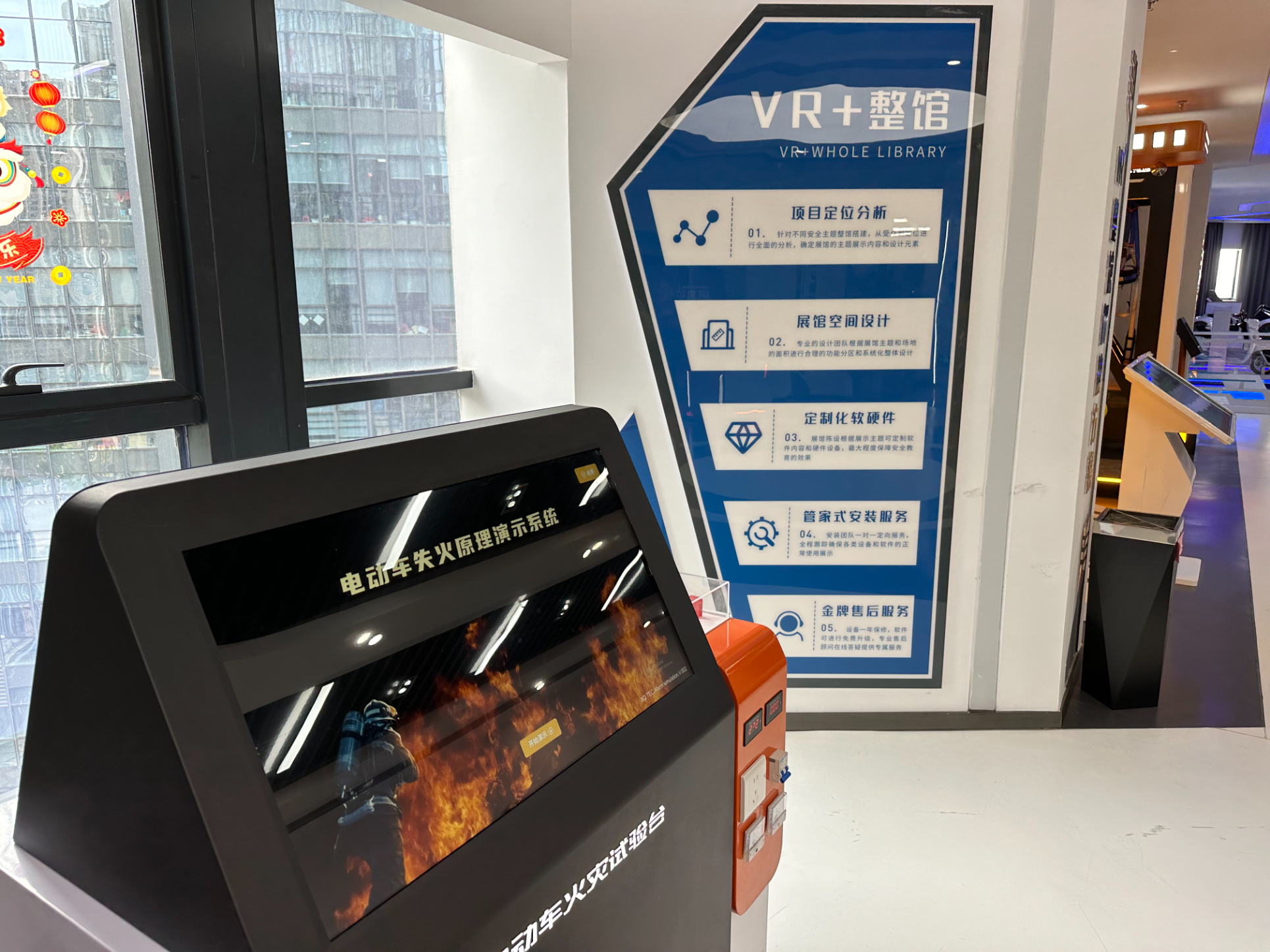 既然是智能化安全体验馆,怎么能少了VR设备呢!第三个展区便是今天的压轴戏---VR安全体验区。VR与安全体验结合的优势是它可以在虚拟现实中展现真实施工事故发生的场景,让体验者学习正确的安全施工方法,身临其境,锻炼体验者应对事故发生的应急能力,通过虚拟现实更深刻的增强体验者的施工知识。图为雅努思员工穿戴VR设备进行安全体验。